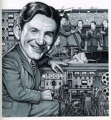 Also, here’s a link to Irwin Chusid’s Raymond Scott blog which has two wonderful birthday tributes from Irwin (Director of the Raymond Scott Archives, as well as Raymond Scott authority and album producer), and Jeff Winner, who runs RaymondScott.com and is also an RS authority and album producer: http://www.raymondscott.blogspot.com/  AND, on the blog you’ll also find info about a limited edition centennial print by renowned caricaturist (and Scott fan) Drew Friedman (shown at left).